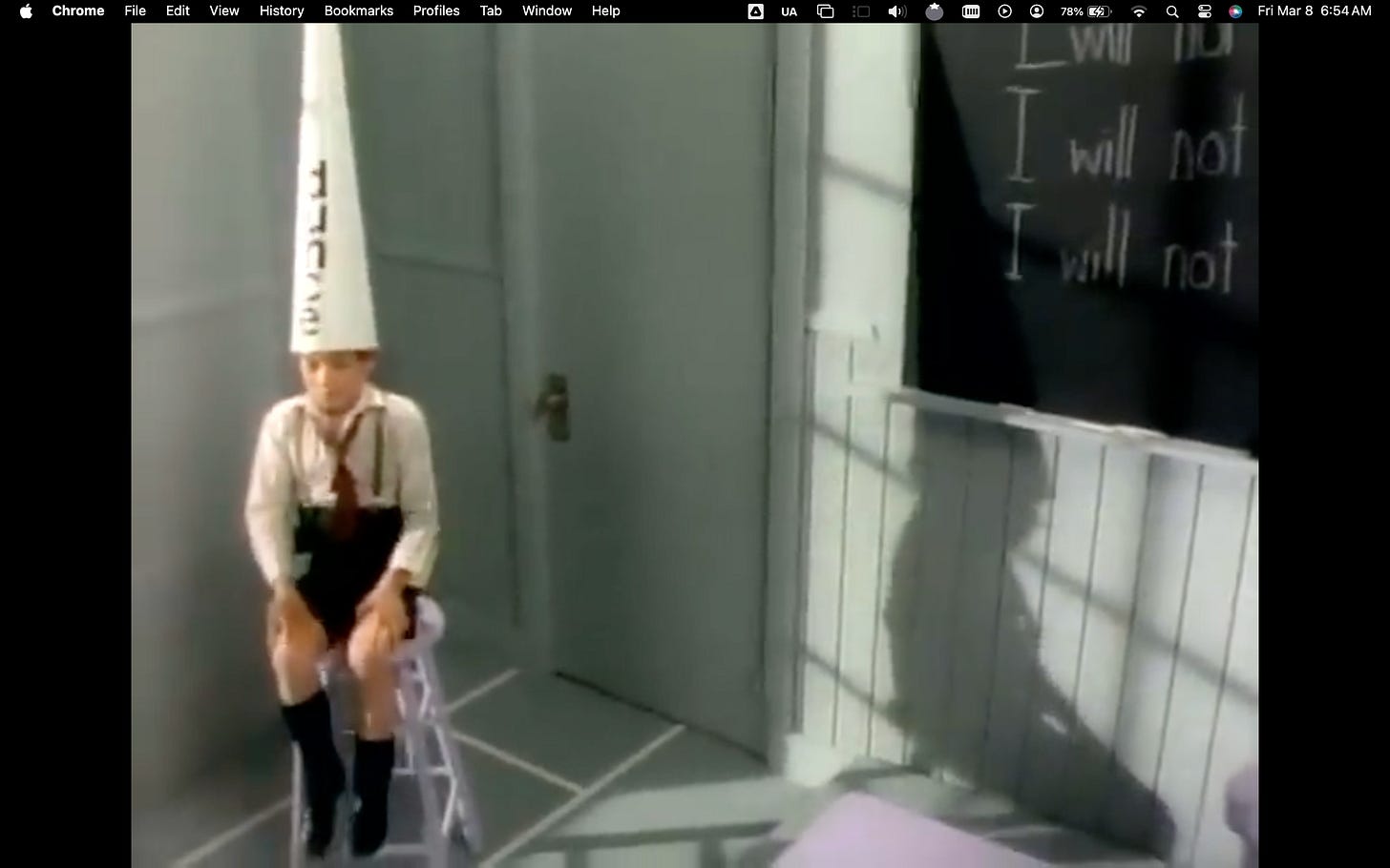 The video opens but doesn’t start with 80s star Deniece Williams. Instead, it starts with a little boy with a fidgeting problem who’s wearing a tall ass DUNCE cap and sitting under a board where he’s written: I will not fidget.