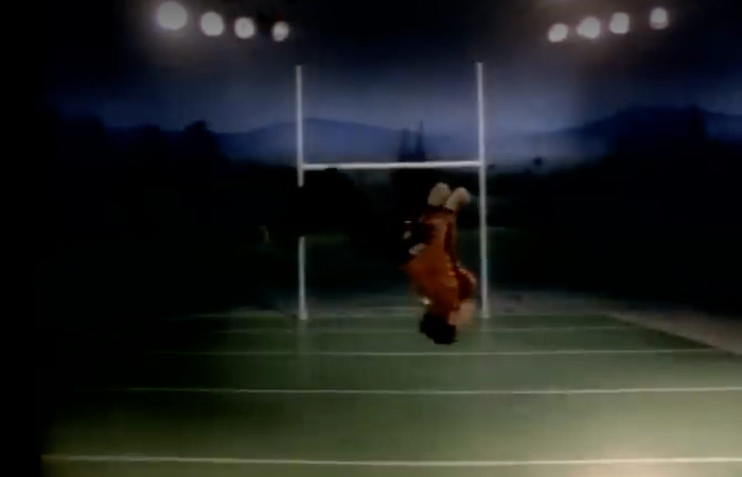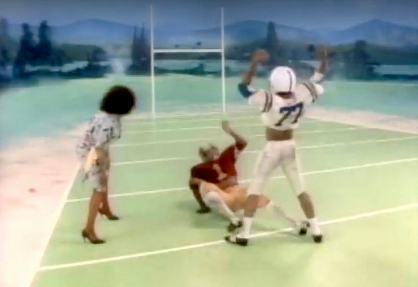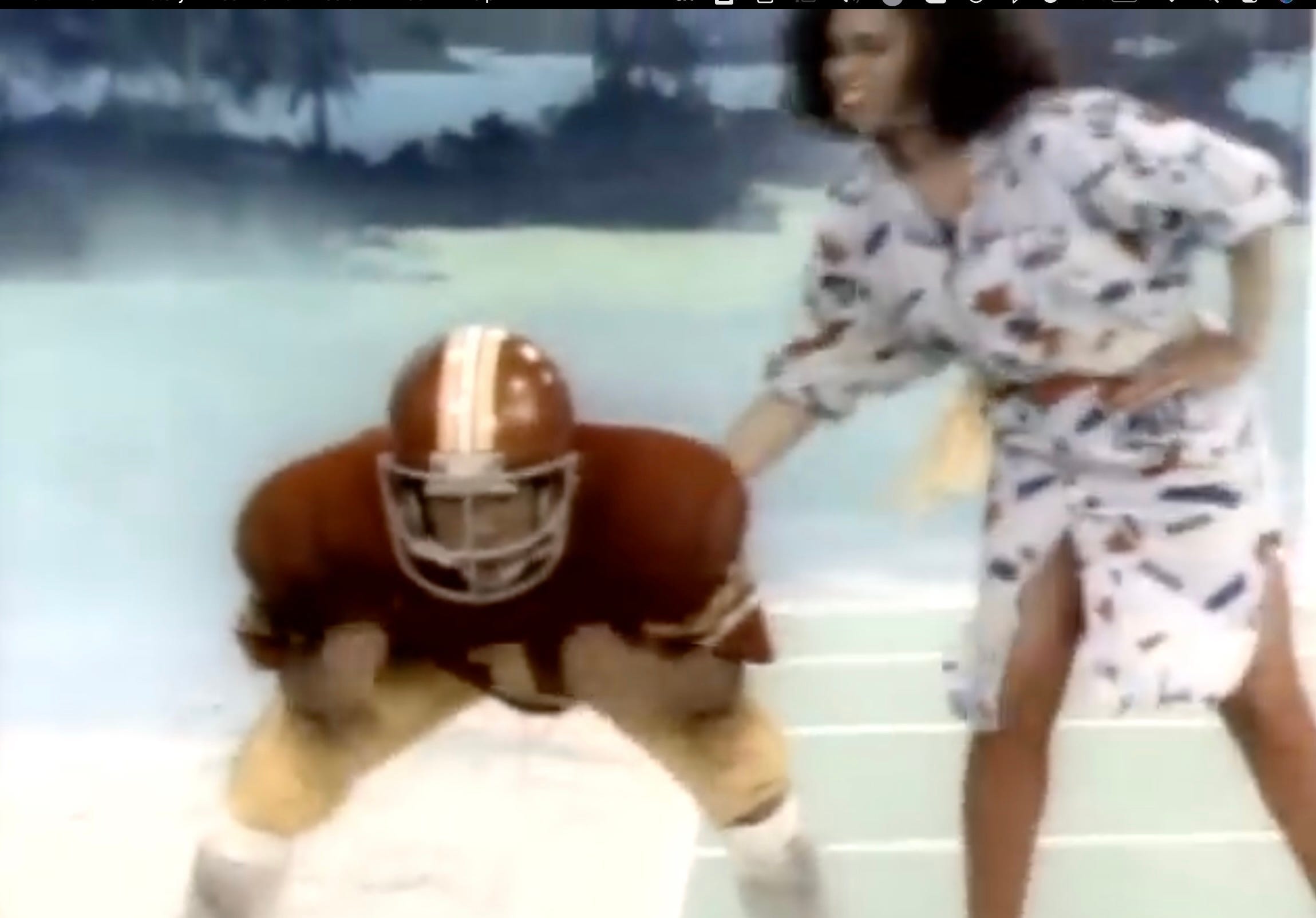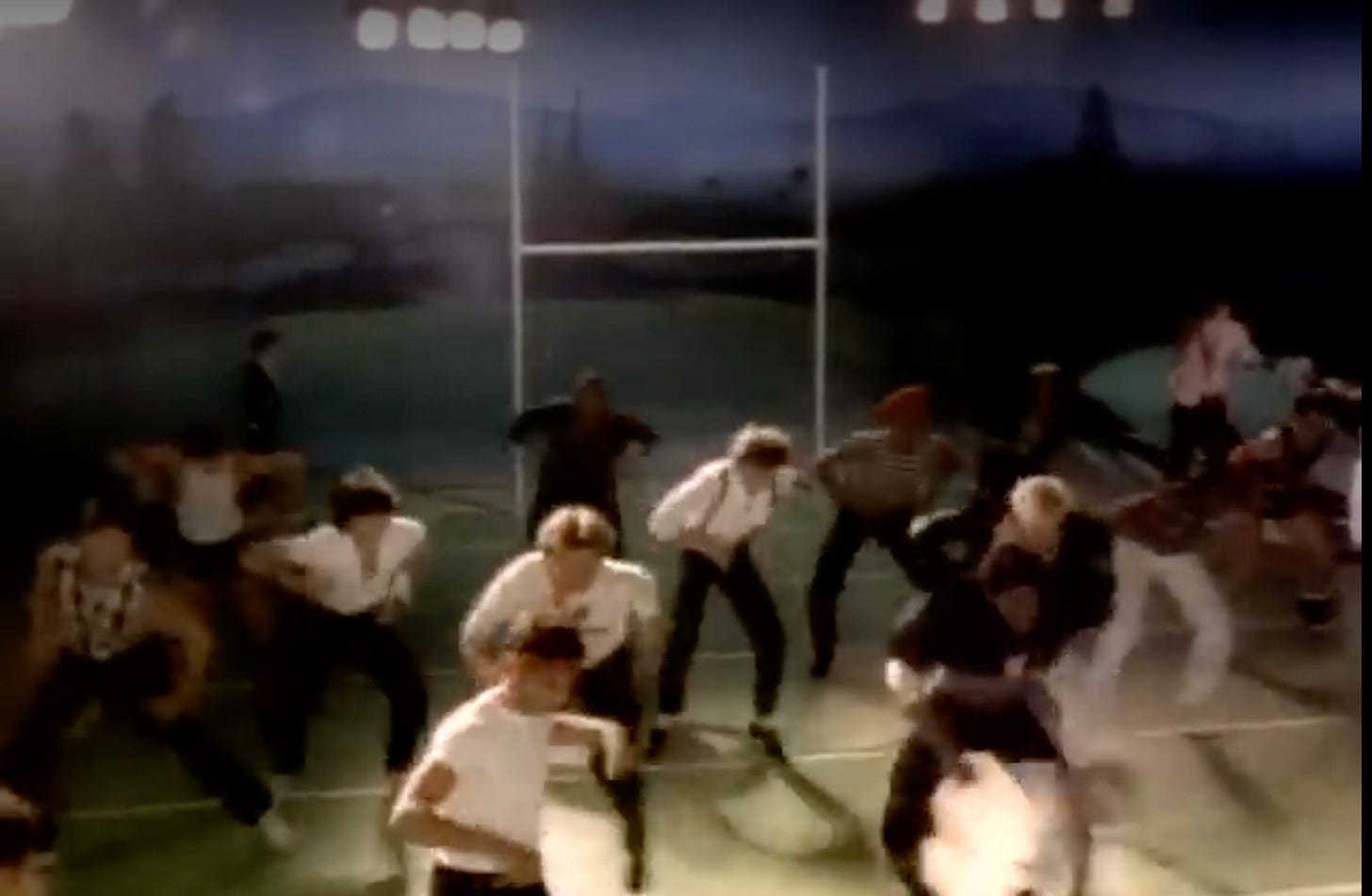 When we come back to Mommy and her loving Boy, we see him on a football field. He’s pumping his arms to the beat. Luckily, he’s not there alone.